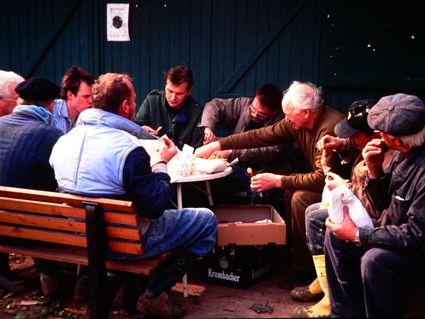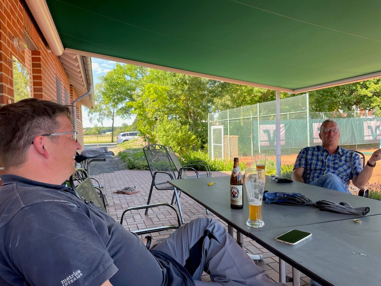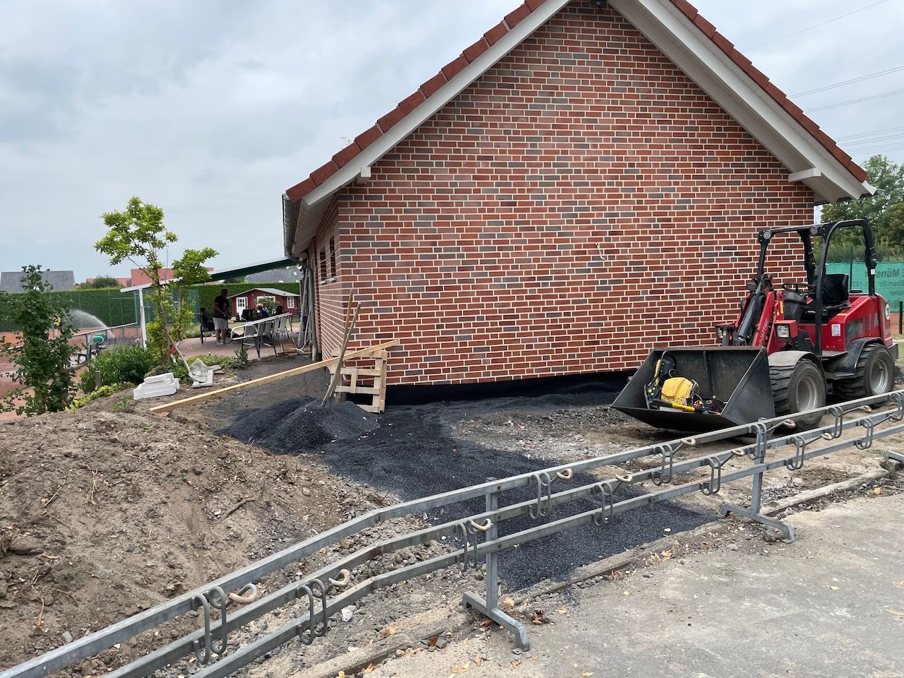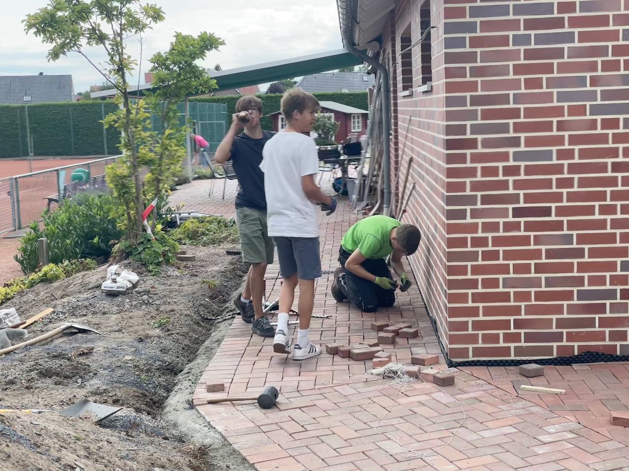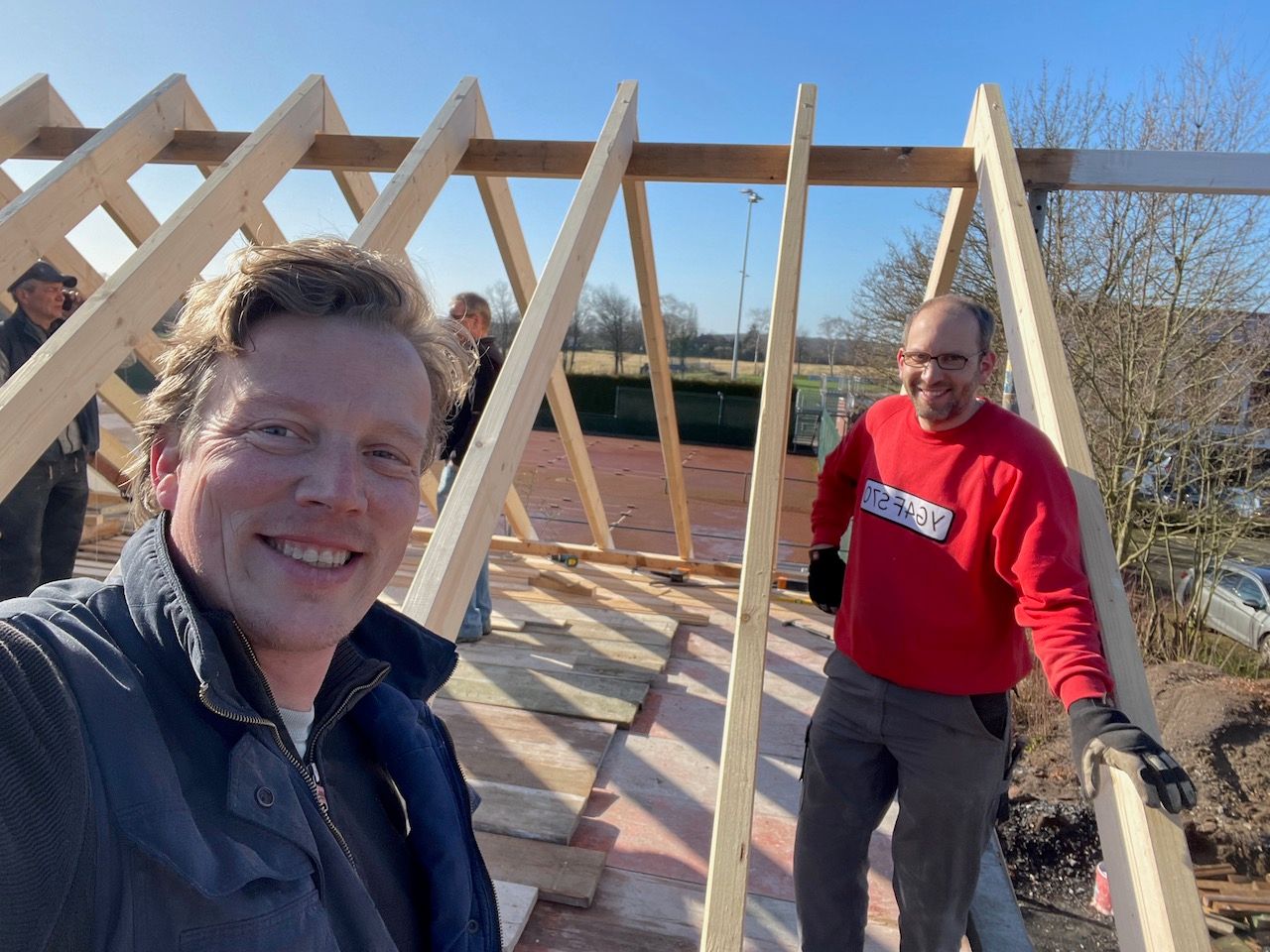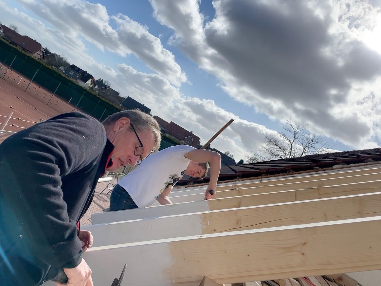 Im TCR engagieren sich offensichtlich nicht nur Tennisspieler, sondern auch eine ganze Menge Dachdecker, denn nicht anders ist es zu erklären, dass innerhalb von drei Stunden das neu errichtete Duschhaus schon ein Dach über dem Kopf hatte (unter fachkundiger Anleitung eines Vollprofi-Dachdeckers). Die Verpflegung der freiwilligen Helfer erfolgte allerdings zur allgemeinen Sicherheit auf festem Boden.